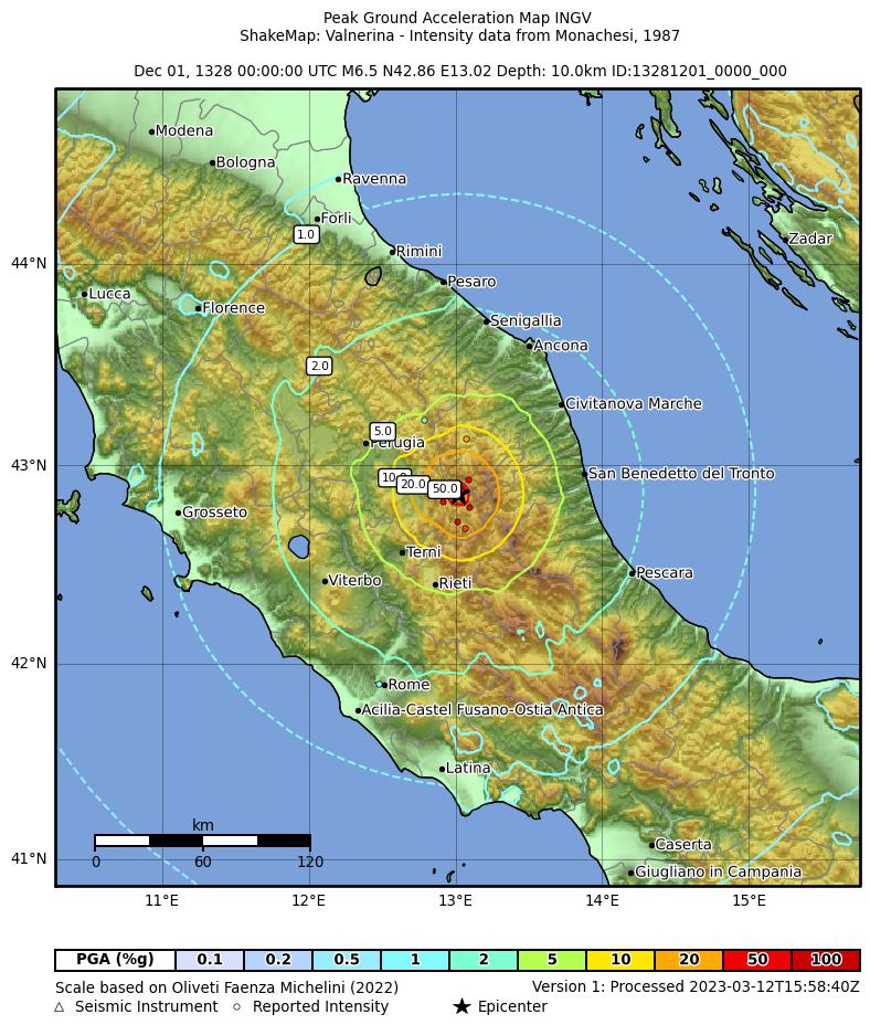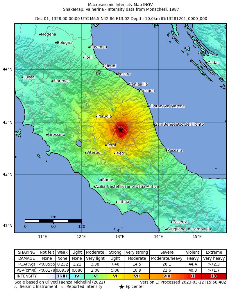 | CPTI04 | 1328-12-01 | 42.856 | 13.018 | -- | Mw 6.44 | 10 | Monachesi, 1987 | ||
