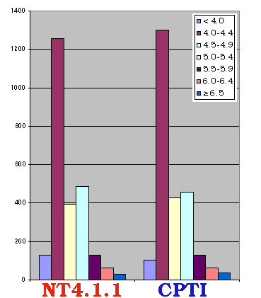 Fig. 2 - Distribuzione delle classi di magnitudo in NT4.1.1 e in CPTI