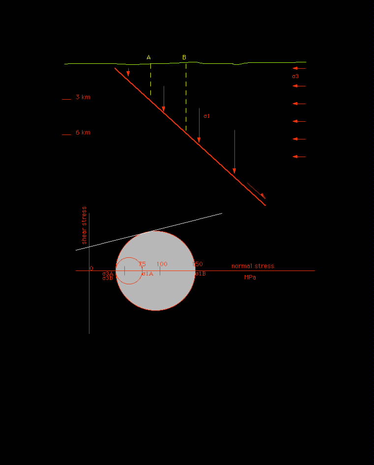 Fig. 5. Lungo una faglia normale, il s1 coincide col carico litostatico e aumenta colla profondità, e quindi s1A<s1B. Per semplicità grafica il s3 è mantenuto costante colla profondità. Muovendosi verso il basso il cerchio di Mohr si allarga verso destra, avvicinandosi all'inviluppo della rottura. Quindi, al contrario degli ambienti compressivi, la rottura appare più facile in profondità per gli ambienti distensivi nella crosta fragile.