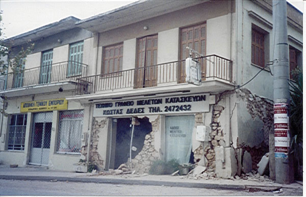Photograph 2, 8 Sept. 1999: Ano Liossia, structural damage to a two-storey building. The ground floor (field stone masonry) suffered serious failure. Grade of damage 4.