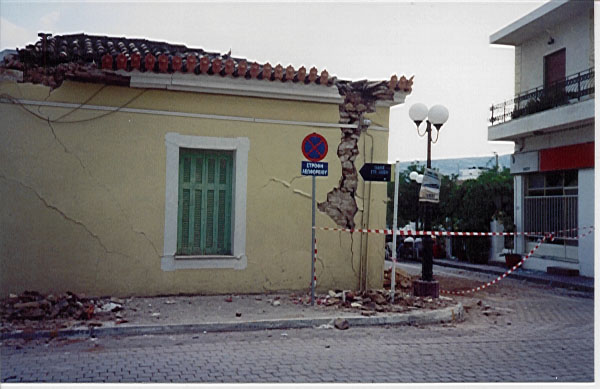Photograph 3, 8 Sept. 1999: Ano Liossia, structural damage to a one-storey building of adobe (field stone?) masonry (loss of connection between the corner on the right-hand side of the photo and the external walls). Grade of damage 4.